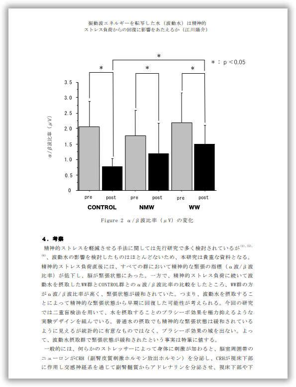 国士舘大学では、波動水は理屈はまだわからない部分はあるが、ストレスレベルの軽減に効果があったという研究論文が公開されています。